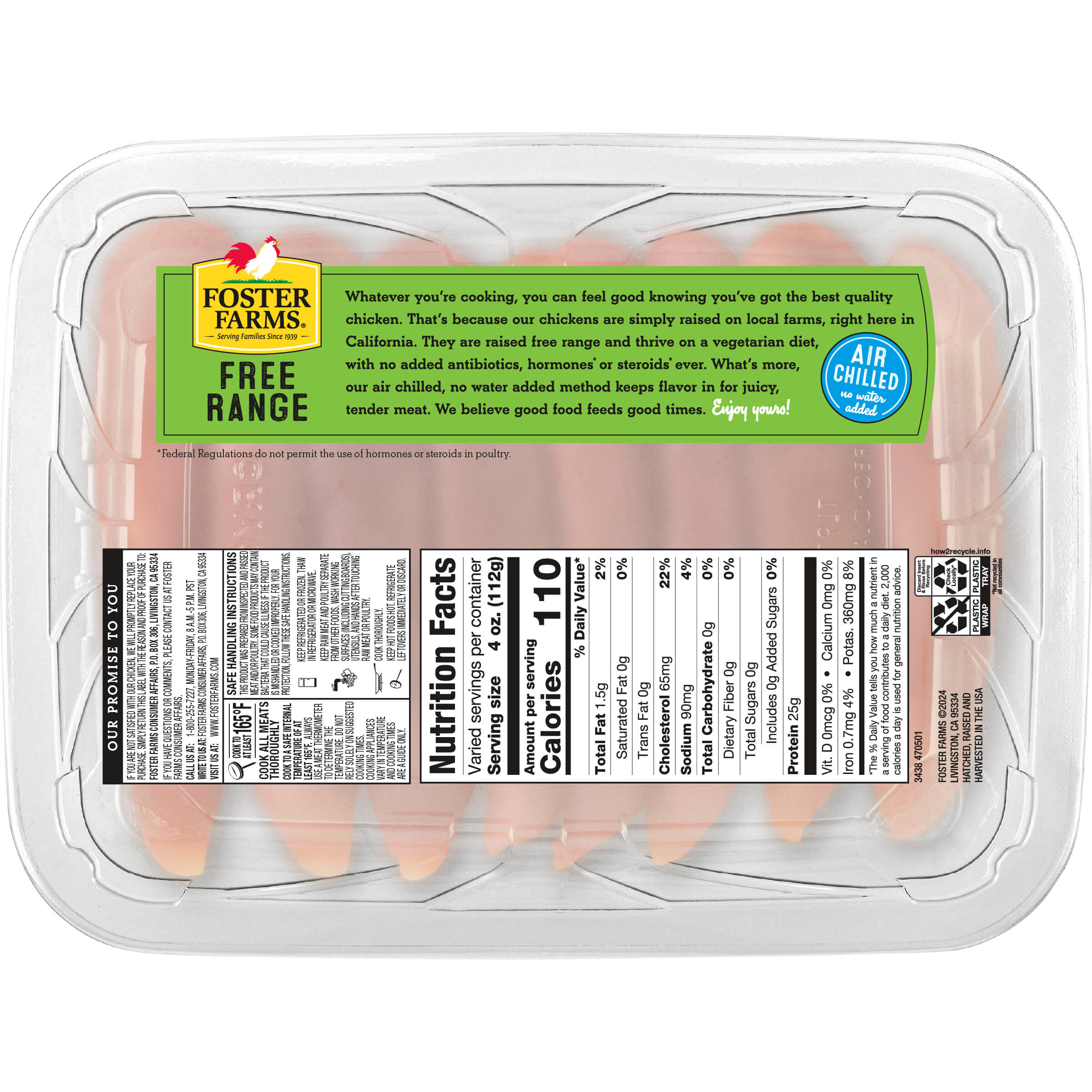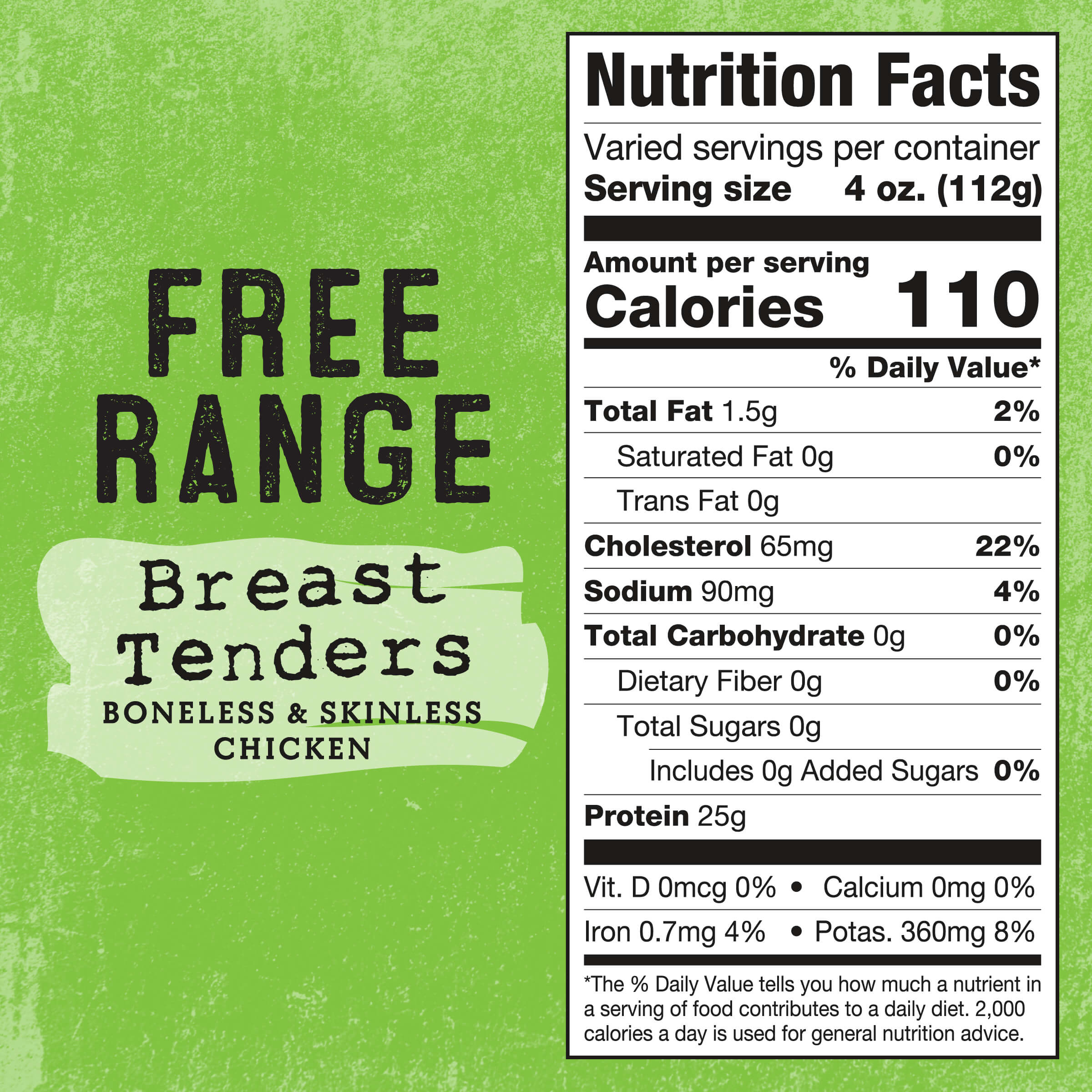 There are 110 calories in each serving of Foster Farms Simply Raised Chicken Breast Tenders. Each serving is 4oz, 112 grams.
