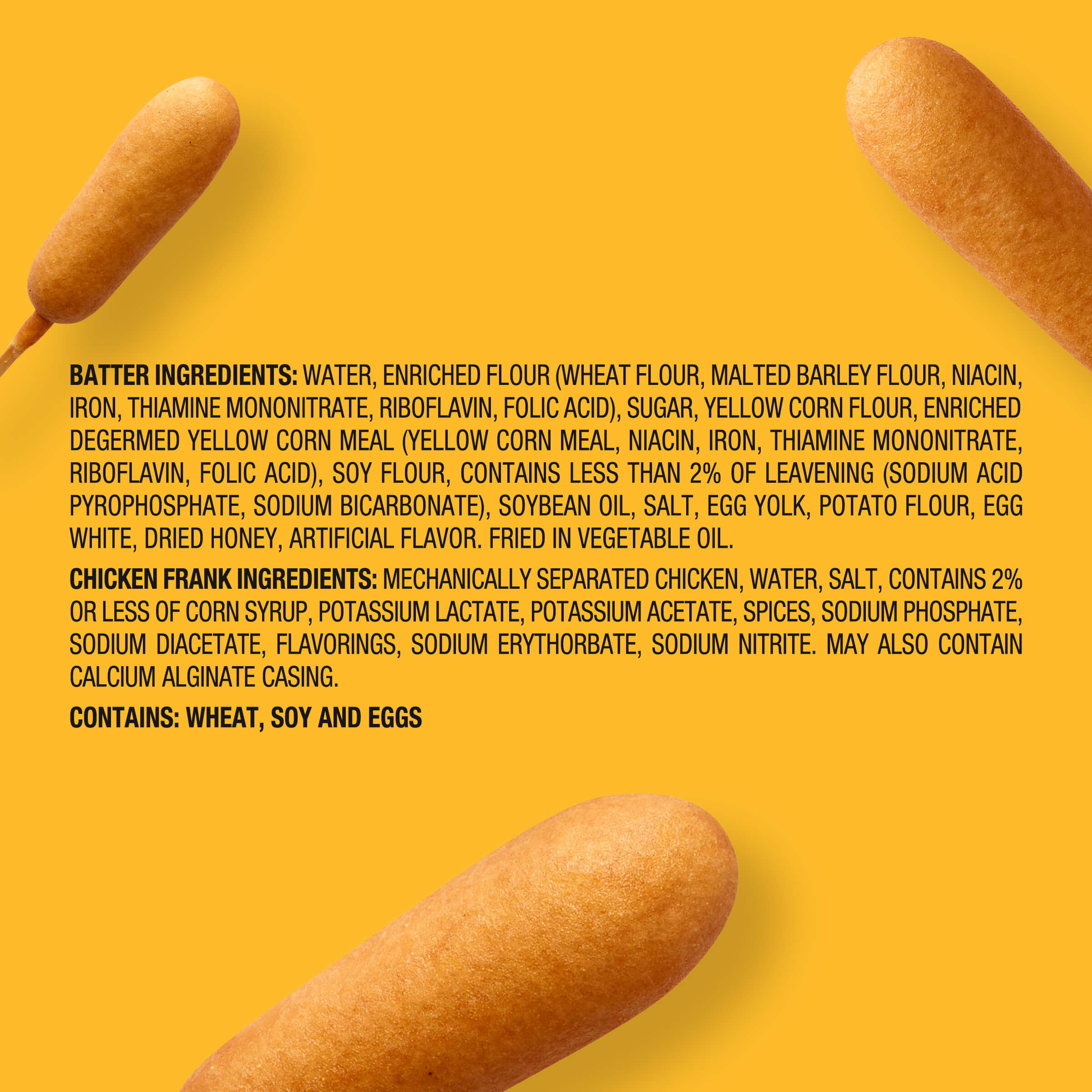 Our batter is made of Water, enriched flour (wheat flour, malted barley flour, niacin, iron, thiamine mononitrate, riboflavin, folic acid), sugar, yellow corn flour, enriched degermed yellow corn meal (yellow corn meal, niacin, iron, thiamine mononitrate, riboflavin, folic acid), soy flour, contains less than 2% of: leavening (sodium acid pyrophosphate, sodium bicarbonate), soybean oil, salt, egg yolk, potato flour, egg white, dried honey, artificial flavor. Fried in vegetable oil. Our franks are made of chicken, water, salt, contains 2% or less of corn syrup solids, potassium lactate, potassium acetate, spices, sodium phosphate, sodium diacetate, flavorings, sodium erythorbate, sodium nitrate.Mechanically separated chicken, water, salt, contains 2% or less of corn syrup solids, potassium lactate, potassium acetate, spices, sodium phosphate, sodium diacetate, flavorings, sodium erythorbate, sodium nitrate.